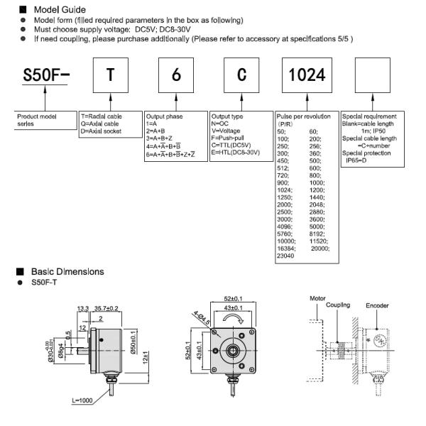 Flange diameter 52*52mm S50F solid shaft encoder installation size 43mm 11520 resolution